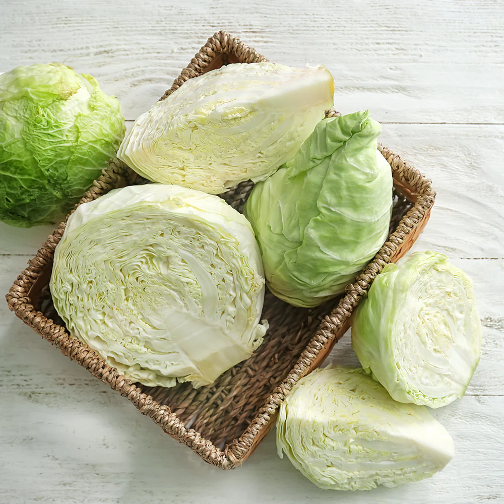 Varieties include smooth-leaf green (Drumhead), crinkly-leaf Savoy, and firm red cabbage, all low in calories but rich in nutrients like Vitamin C and K.